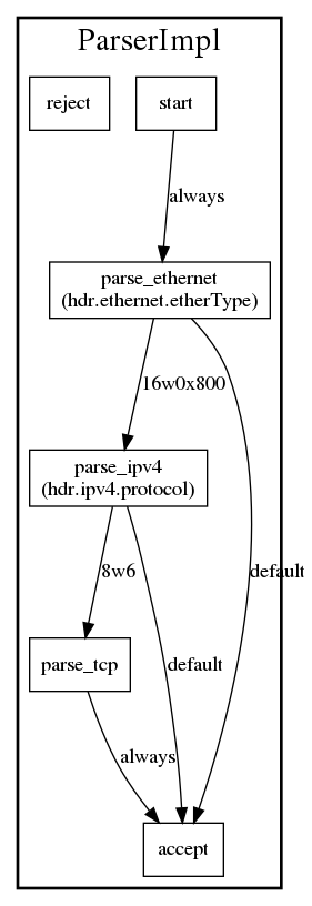 info (object)name - Filename of P4 program.nodes (array) - Contains objects, representing program blocks.type - Type of program block. Valid values are "parser" and "control".name - Name of program block.nodes (array) - Contains object, representing nodes of CFG.node_nmb - Index of given object in array nodes.name - Node label.type - Type of node.type_enum - Enum value, representing type of node in backend p4c-graphs.transitions (array) - Contains objects, representing transitions between nodes in nodes.from - Index to node in nodes, from which edge starts.to - Index to node in nodes, in which edge ends.cond - Edge label.Objects which represent program blocks are ordered in nodes, in the order in which they are defined in the main declaration of P4 program.